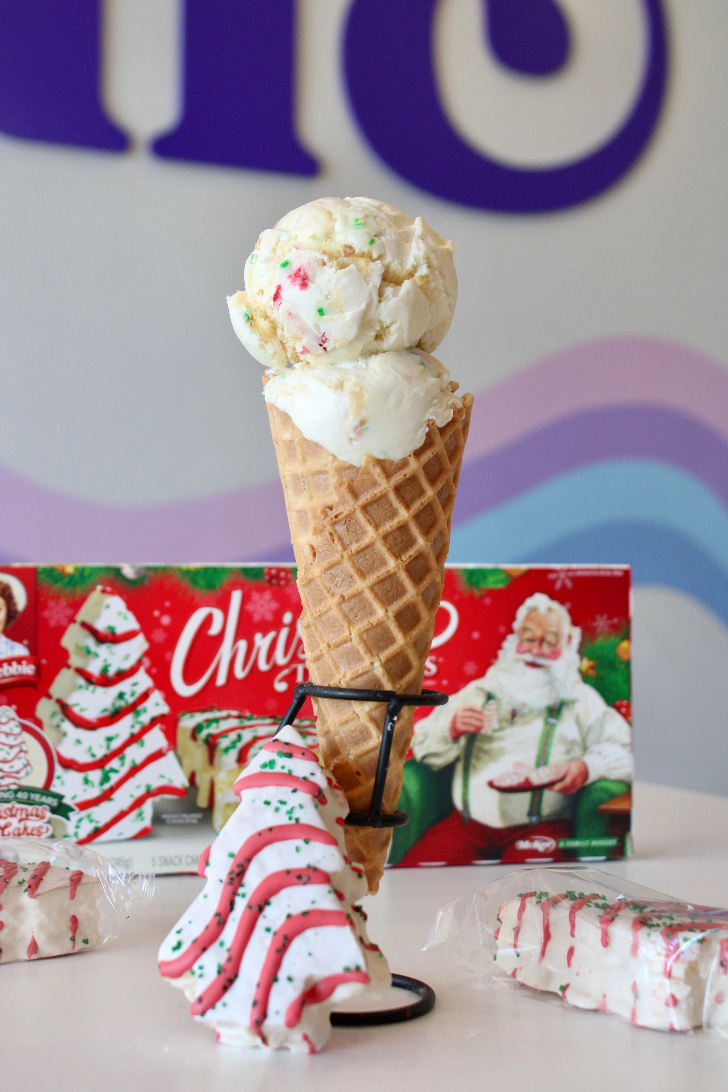 Vanilla ice cream + Little Debbie Christmas Tree Cake pieces + holiday sprinkles